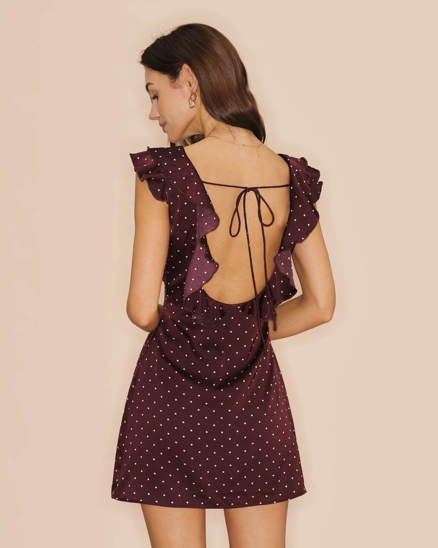 Vestido mini de cetim roxo com decote em V e bolinhas