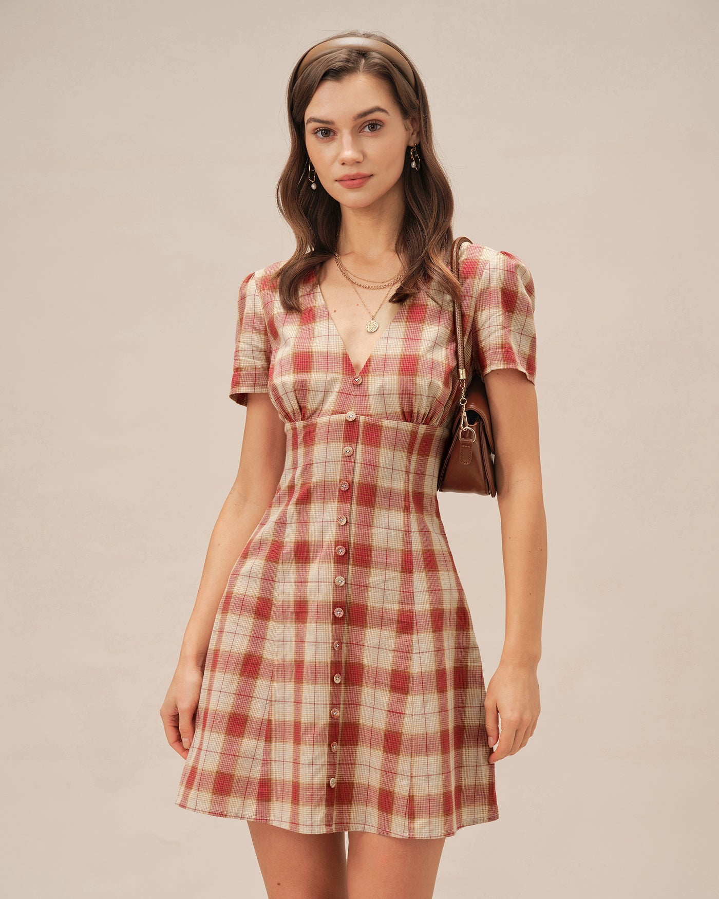 Vestido mini de xadrez vermelho com decote em V - atrevido, festivo e chique